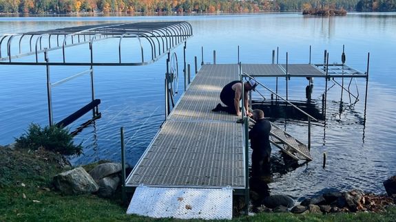 Spring dock installation begins once ice-out conditions allow safe shoreline access, typically early April. Our goal is to have all seasonal dock installations ready before the boating season begins.